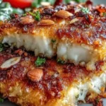 In another bowl, beat the large eggs until they are well combined. Pat the chicken breasts dry with paper towels, then dip each breast first into the egg mixture, making sure it’s completely coated. Next, dredge the chicken in the almond mixture, pressing gently to help the coating stick. In a large skillet, heat 2 tablespoons of olive oil over medium heat. Carefully place the chicken breasts into the skillet and sear each side for about 2-3 minutes or until they are golden brown. Once seared, transfer the chicken to the prepared baking sheet and bake in the oven for about 12-15 minutes, or until the internal temperature reaches 165°F (74°C).