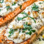 - Spread the cheese mixture evenly over the top of each salmon fillet.