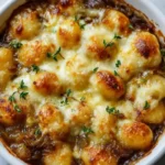 A comforting blend of French onion soup flavors with pillowy gnocchi, topped with gooey cheese, perfect for cozy dinners.