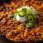 A hearty one-pan meal bringing the rich flavors of enchiladas without the fuss, packed with ground beef, beans, corn, rice, and melty cheese.