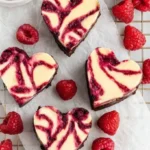 Delicious and visually stunning heart-shaped brownies with a rich chocolate base and creamy raspberry cheesecake topping.