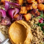 To store leftovers, place the components in separate airtight containers. Store the roasted vegetables, quinoa, and purée in the fridge for up to 3 days. Reheat them in the microwave or on the stovetop before serving. The flavors may even deepen, making the leftovers just as delicious as when freshly made.