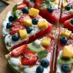 Fresh Watermelon Pizza with Coconut Yogurt is a fun, nutritious, and visually stunning treat that’s sure to be a hit this summer. With its refreshing flavors and bright colors, it’s not only a feast for the taste buds but also for the eyes! So go ahead, gather your ingredients, and surprise your friends and family with this delightful recipe. You won’t be disappointed! Enjoy this refreshing twist, and don’t forget to get creative with your toppings!